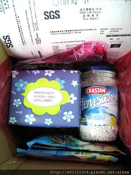 收到這箱還真有重量!裡面有一大罐氣泡蘇打晶粒以及三包蜜桃茶的組合