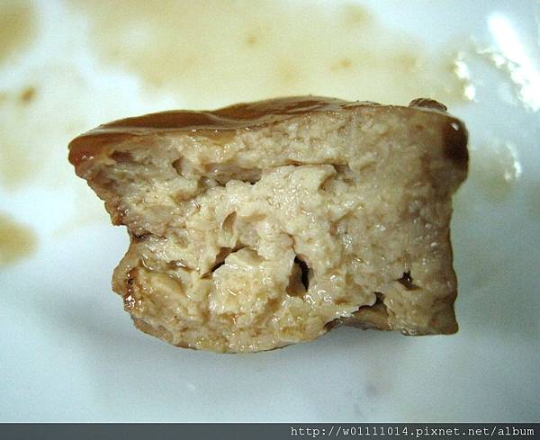 看這豆干好像之前買過的千層豆干一樣~裡面都有這種洞隙,隱約夾雜一點醬汁