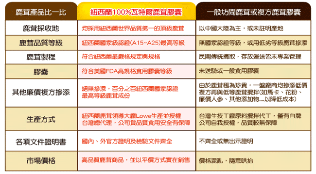 瓦特爾鹿茸膠囊與一般坊間鹿茸或複方鹿茸比較一下: